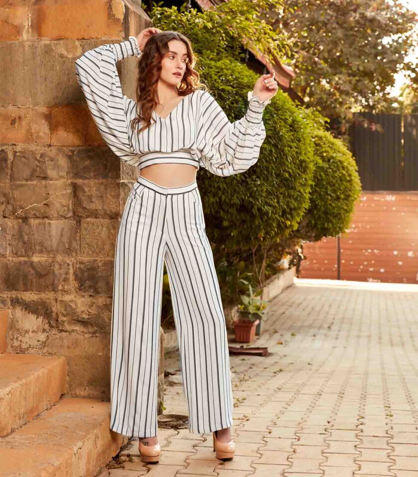 White and black striped crop top with shirred cuff detailing and palazzo pant set.