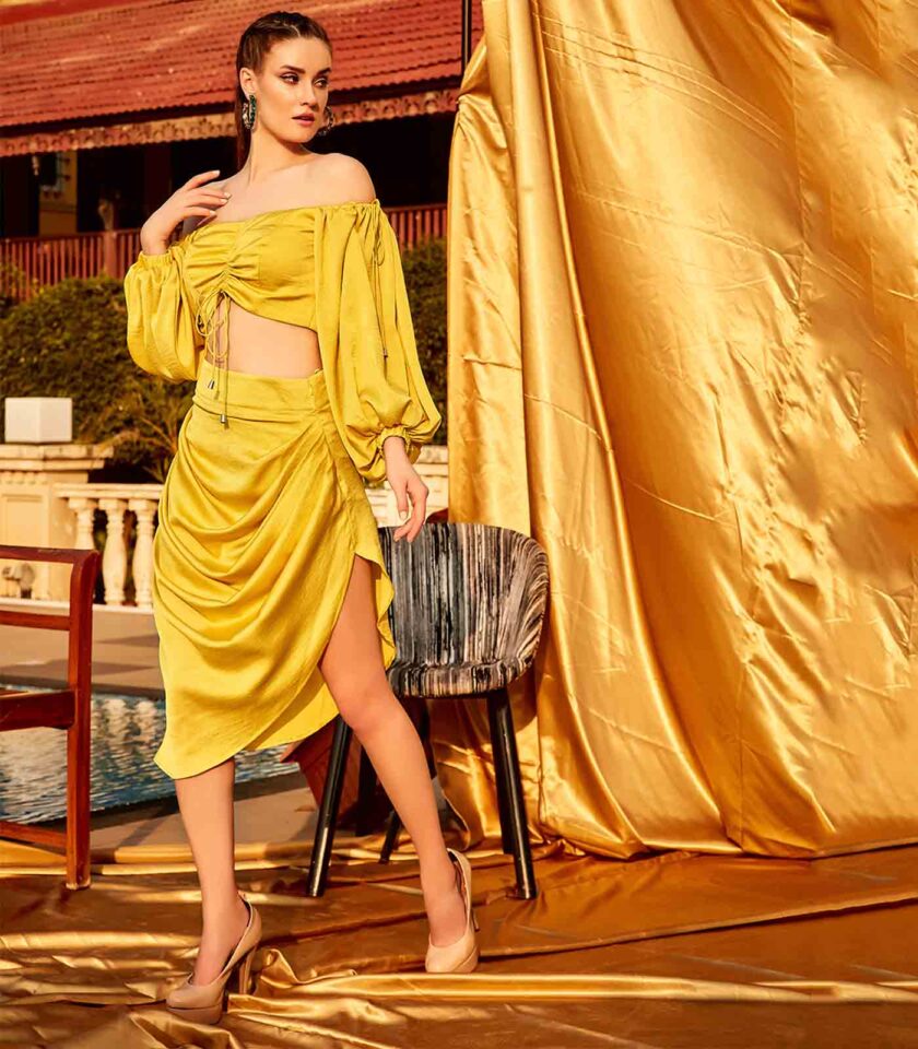 Yellow Gold Off-Shoulder Crop Top with Draped Skirt